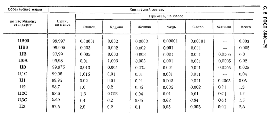 Для ГОСТ 3640-79 и ГОСТ 3640-94, общее содержание различных добавок и примесей в цинке марки ЦВ0, должно составлять не более 0.005%.